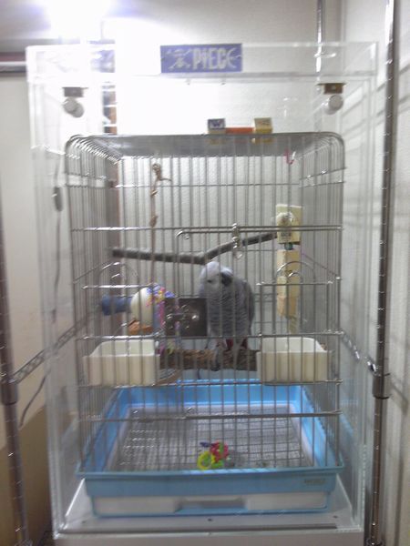 ケージの掃除をするときは、ケージを出して空になったアクリルケースの中に、待ってて台を置いて扉を閉めたら、台に止まって大人しくしてました。