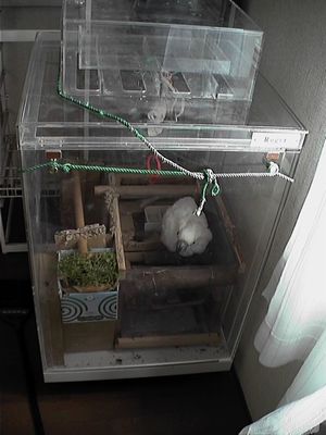 カゴを清掃するついでに、餌のまき散らしとか、与える植物置き場のスペースを改良したく、カゴなしで入れてみました。すごく広くなり、よく見えます。