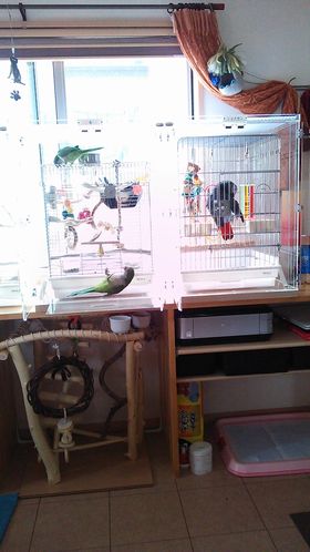 オキナのふぁ&びぃの住まいですが、ケージを出し、アクリルケースに卓上用止まり木を入れ、模様替えをしました!