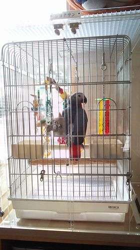 ヨウム君の止まり木も台の下にあって、遊び道具も満載。ストレスなく過ごせそうです。