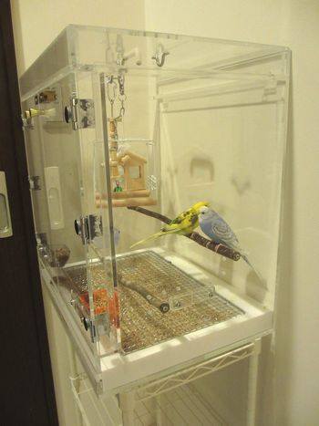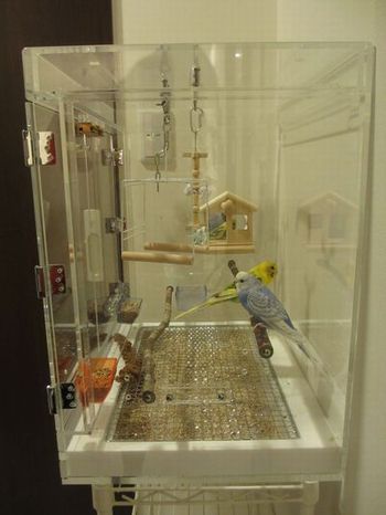 写真は、購入した当日に撮ったものでして、まだインコ達がびっくりして止まり木にじっとしてブランコさえ乗ろうとしなかった状態でしたが、