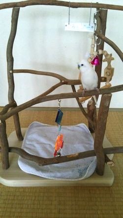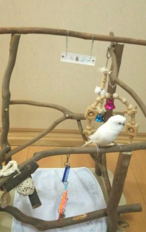 オカメのぷーちゃんは、まだ幼くジムで遊べないようで、しろちゃんだけようやく乗っています。