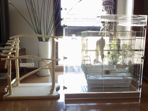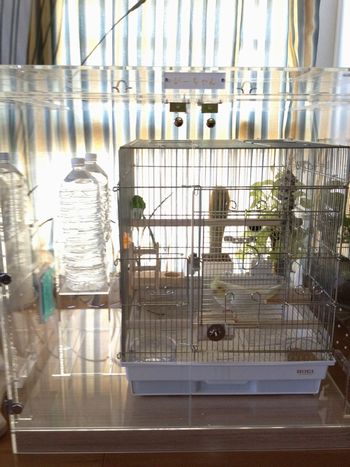 今は暑い季節ですので、凍らせたペットボトルを入れるため、万が一転倒した時のことを考えカゴを入れ使っていますが、秋以降は直接飼いにし、お作りいただいた止まり木などを設置したいと思います。