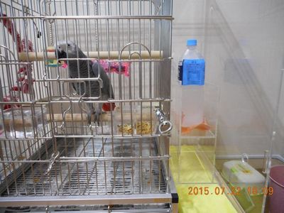 当初はカゴの上にトレイを置いて、ペットボトルを入れるはずが、ようちゃんがクチバシで落としそうなので、側面ユニットになりました。