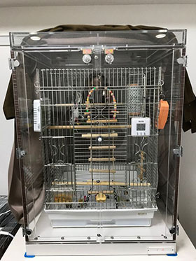ケージの左の引っ掛けられているのはヒーター。