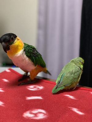 ズグロシロハラインコのキスケと、マメルリハのメルちゃんです↓