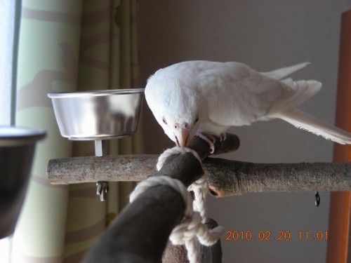 そろそろ使用して2週間。一番上の止まり木を、せわしなくグルグルし、ハシゴ登りもクリアし、お気に入りのロープをカジカジしてご機嫌♪
